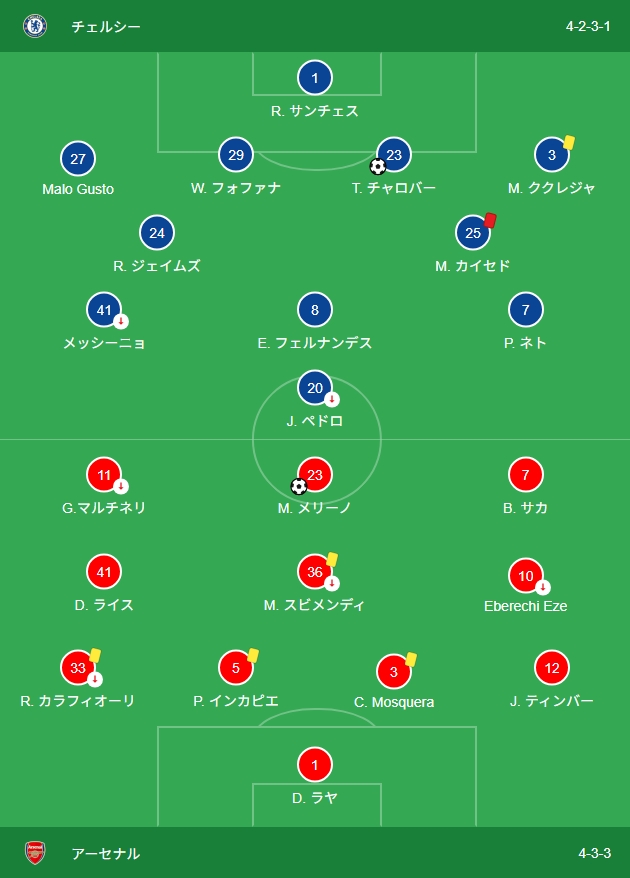 その後チェルシーは基本ブロック守備ながら要所要所でラインを上げる積極的な守備で相手を封じていきますが、サカの個人技から放たれたクロスにメリーノが見事に頭で合わせ同点に追いつきます。